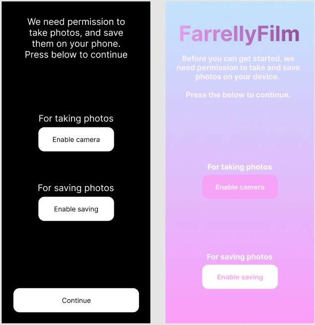 In the early stages of this project I had told a designer friend (relevant below) about this app. They were eager to give it a go, so once I had finished the MVP and published it on TestFlight. I sent them a link to try it out, along with some broad and brief instructions - 'select a filter, take 12 photos, then you'll see them all appear as a roll of film'. Immediately they had a question.
